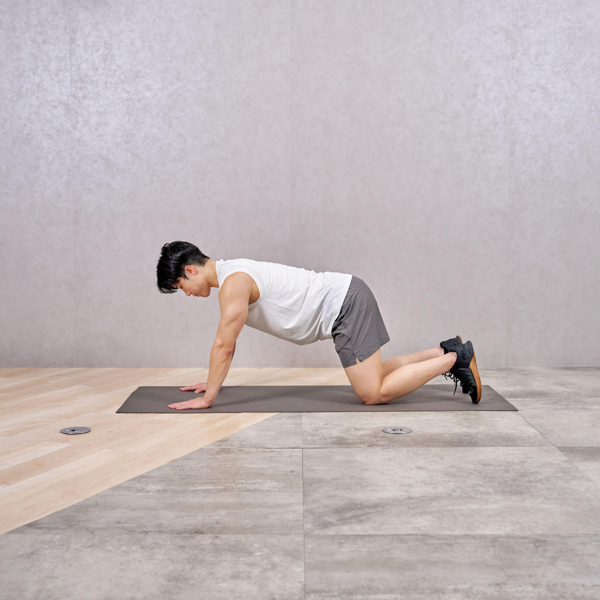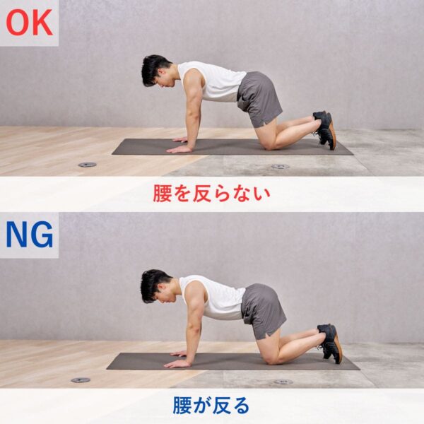 - 腰を高く上げた四つん這いの姿勢になり、への字の姿勢をつくる