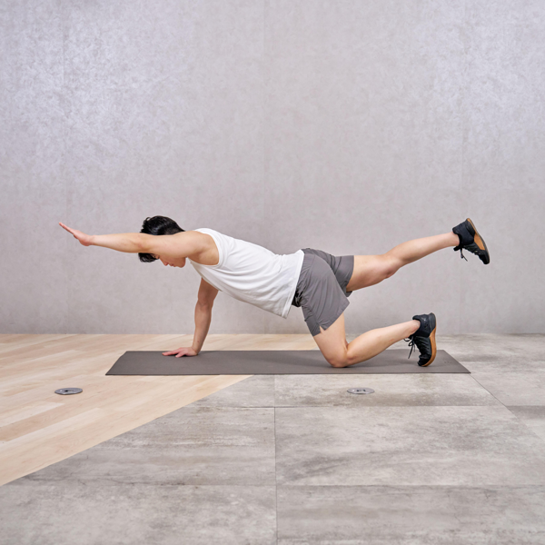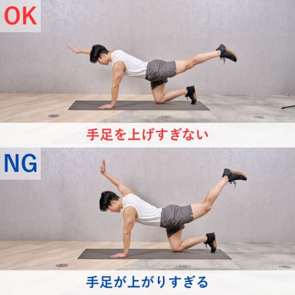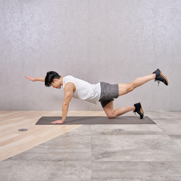 - 同時に反対側の脚を後ろにまっすぐ伸ばす