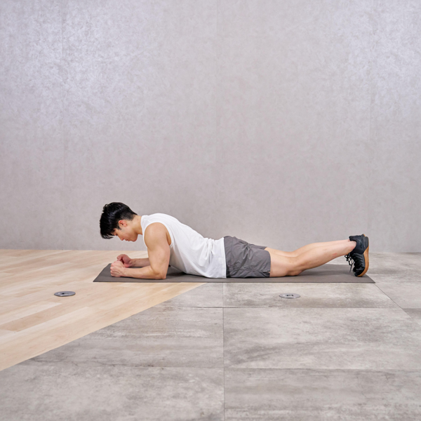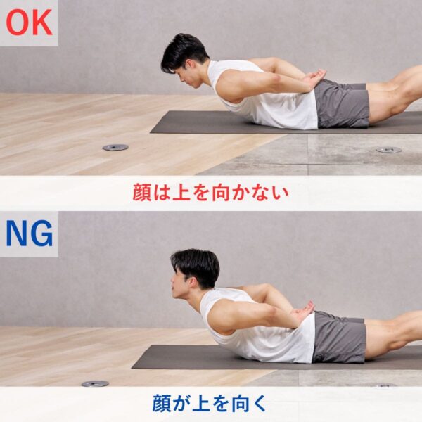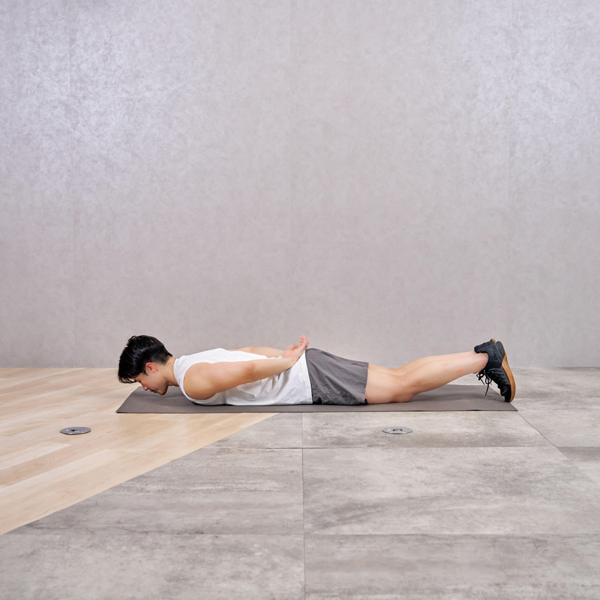 - ひじを曲げながら身体を前に倒し、床ぎりぎりまで額をつけるように上体をおろす