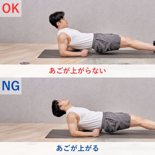 - 頭から足先まで一直線になるように、お腹に力を入れて姿勢をキープする