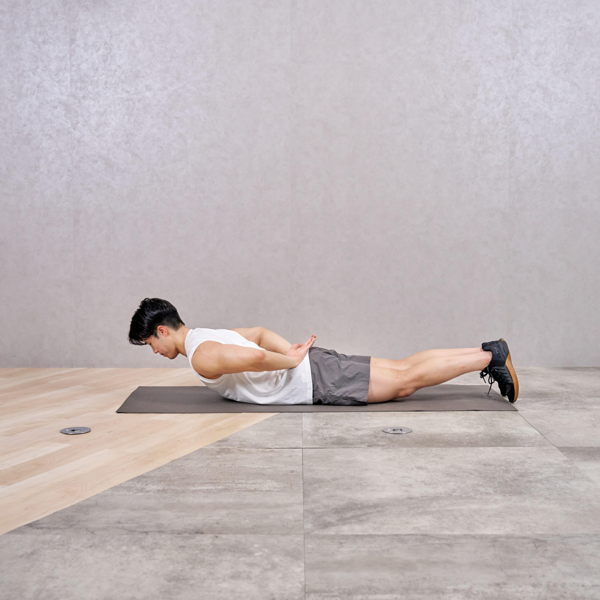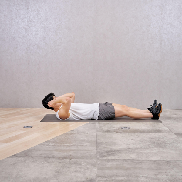 - うつ伏せになり、両手を頭の後ろで組む