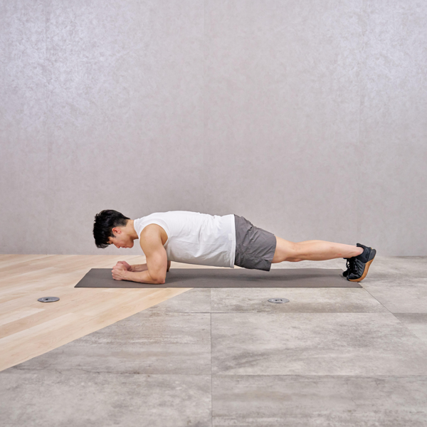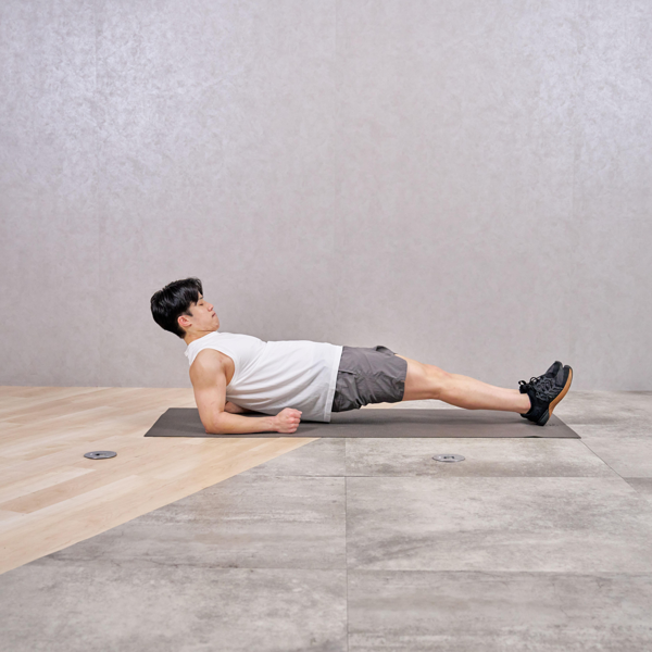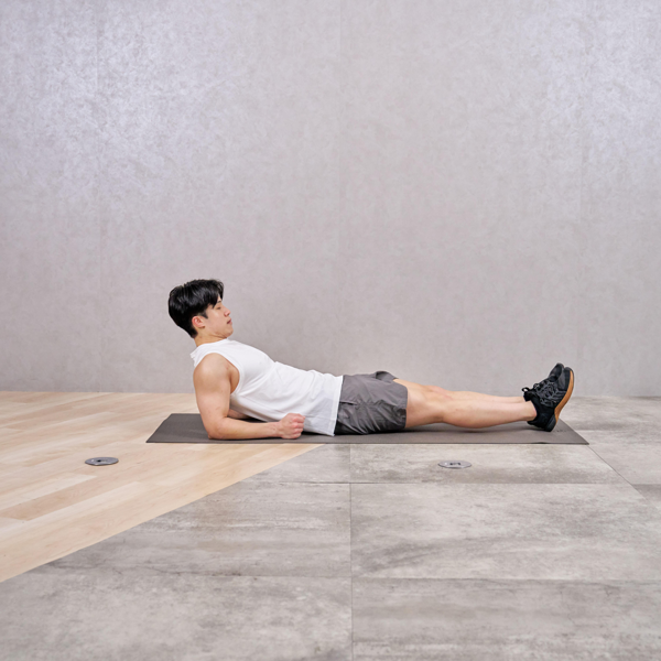 - 息を吸い込みながら、ひじを曲げて体を床に近づける