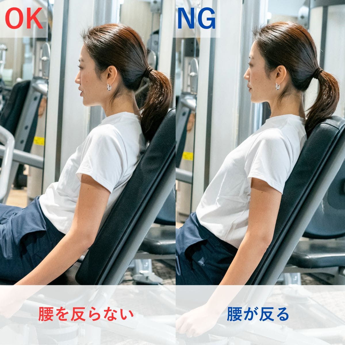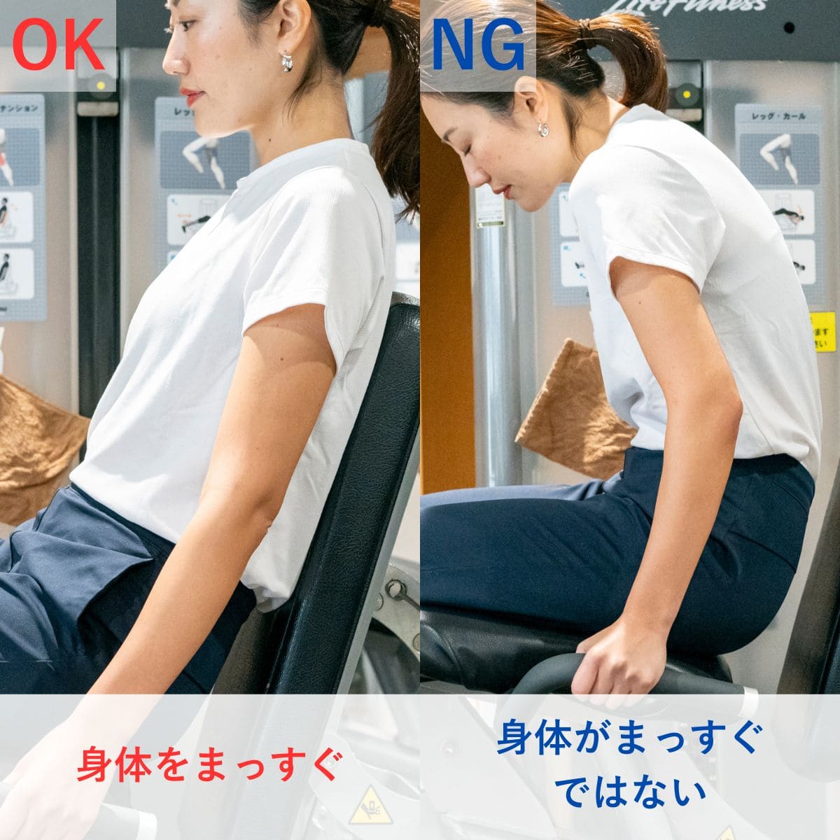 ひざに負担がかかりやすいため、重量設定は控えめにし、動作のコントロールを優先しましょう。