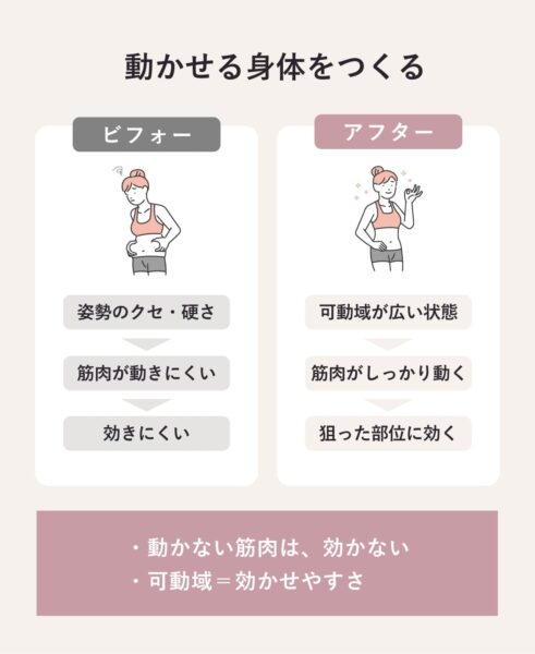 - 可動域を広げて使える筋肉の状態に整える
