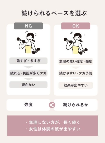 筋トレは継続してこそ効果が現れるため、女性にとって無理なく続けられる強度と頻度を選ぶことが大切。