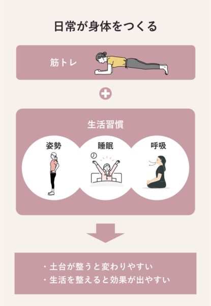 筋トレの効果を最大限に引き出すためには、生活習慣の改善をセットでおこなうことが不可欠。姿勢・睡眠・呼吸・歩き方といった日常の動作は、体型や筋肉の働きに大きな影響を与える。