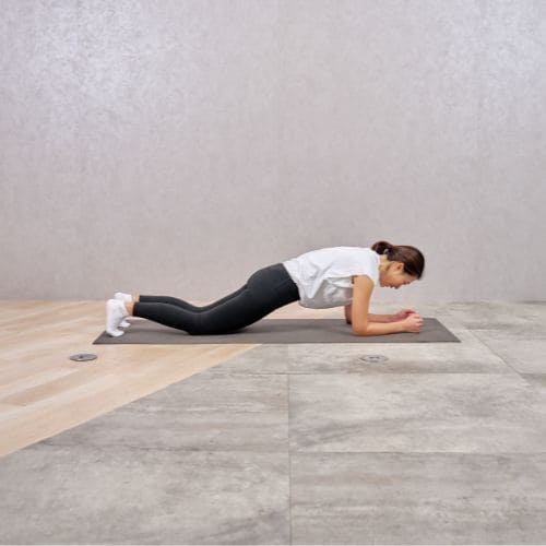 ひざをついていても負荷は十分にかかるため、頭からひざまでを一直線に保つ意識が重要です。腰が反りやすい場合は、お腹を軽くへこませるように力を入れ、自然な呼吸を続けながら行いましょう。