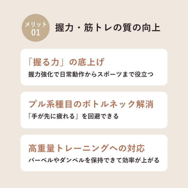 懸垂(チンニング)やデッドリフトなどのプル系種目では、背中より先に手が疲れてバーを離してしまうケースが少なくないが、前腕や握力を強化することで、こうしたボトルネックを解消できる。さらに、バーベルやダンベルを安定して保持できるようになるため、高重量トレーニングにも対応しやすくなる。