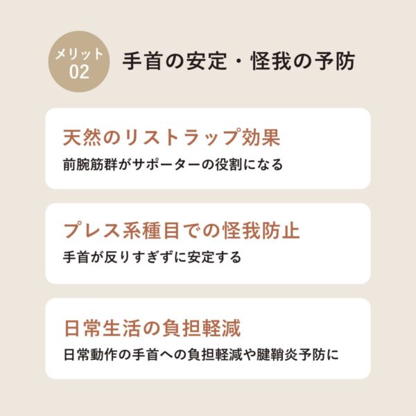 - 手首の安定性が増し、腱鞘炎や怪我の予防になる