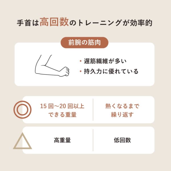 - 手首は「高回数(ハイレップ)」でトレーニングする