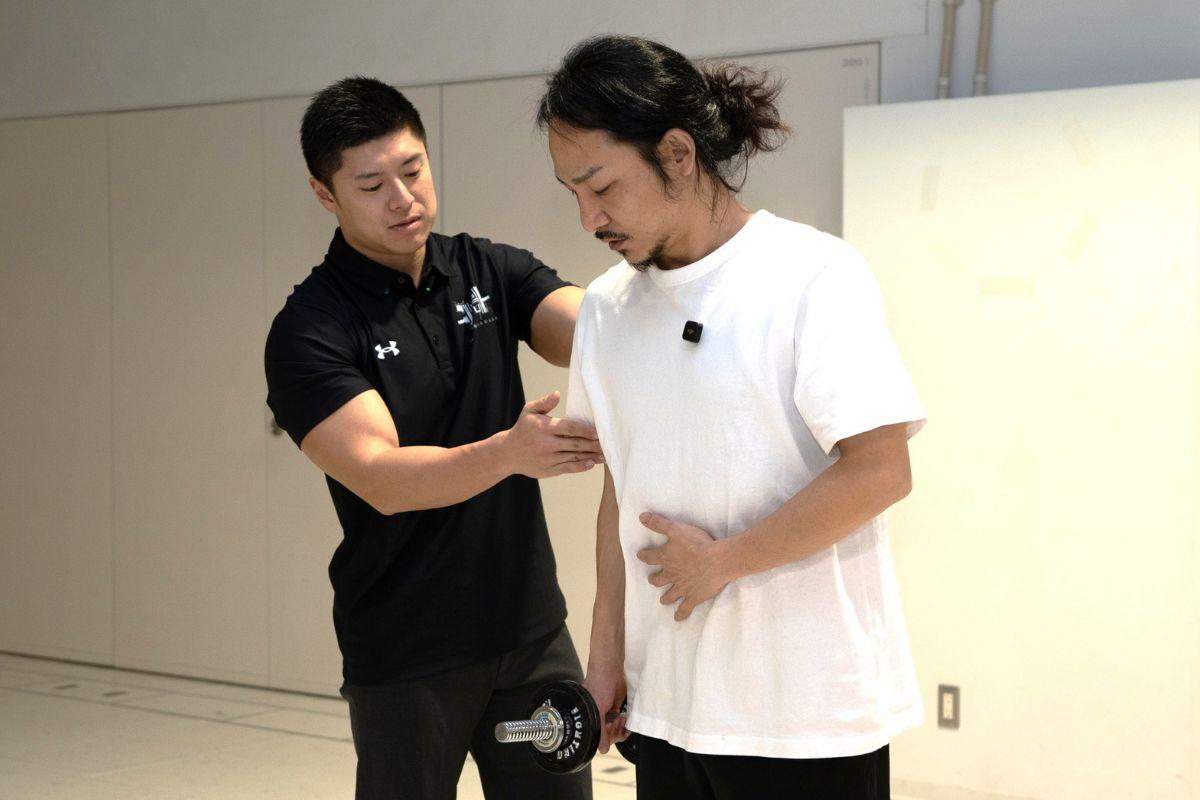 ひじが前後に動いているときは、腕全体で持ち上げている感覚になり、前腕への効きが弱いと感じました。ひじを反対側の手で留めることで動作が安定し、腕橈骨筋にピンポイントで負荷が乗るようになりました。