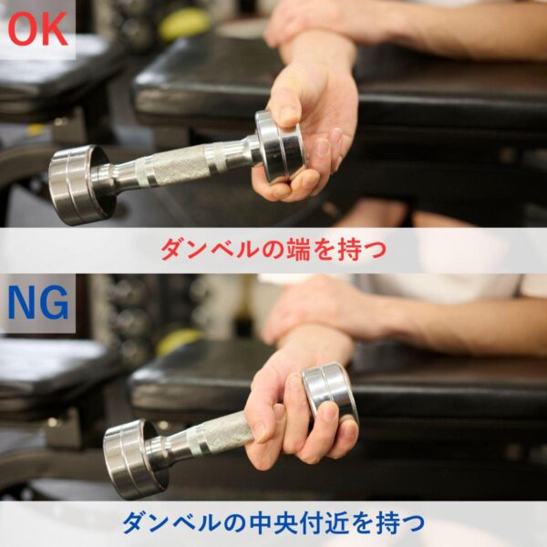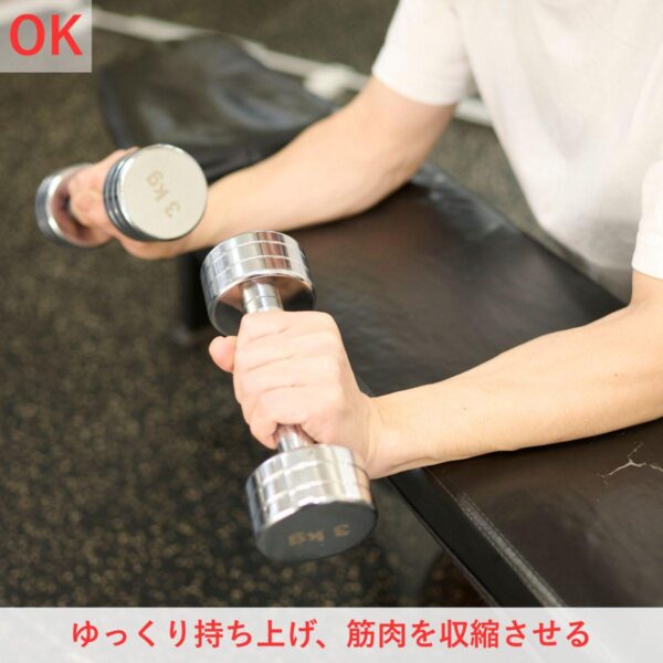 - 手首を反らせた状態から、ゆっくりと巻き込むようにダンベルを持ち上げる