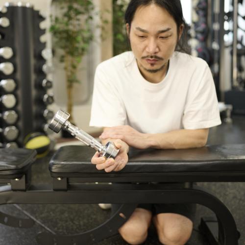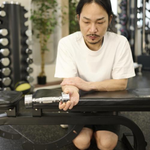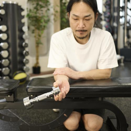 リバース・リストカールは前腕伸筋群を狙う種目のため、扱える重量が軽くなりやすいのが特徴です。ダンベルでの重量を扱いにくいときは、逆の手だけで手首に直接負荷をかける方法がおすすめです。重量にこだわらず、伸筋群に効いている感覚を基準に、動作をていねいにコントロールしながらおこなうことが重要です。