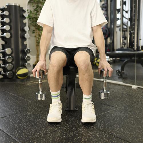 リストカールはダンベルを手のひらで握り込んだまま動かすのではなく、一度指先まで転がすように下ろしてから巻き上げることで、手首の動く幅が広がり、前腕屈筋群全体を使いやすくなります。