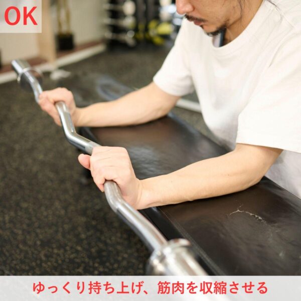 - 手首を反らせた状態から、ゆっくりと巻き込むようにEZバーを持ち上げる