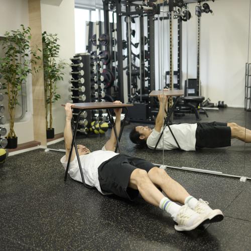 机を使ったインバーテッドローは、自重でおこなえる背中の引く動作トレーニングです。胸を支点に近づけることで、広背筋や肩甲骨まわりをしっかり使えます。しかし、机が不安定だと危険ですので注意するようにしてください。