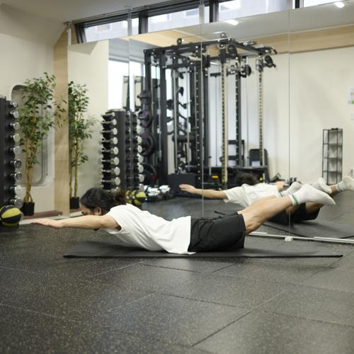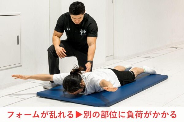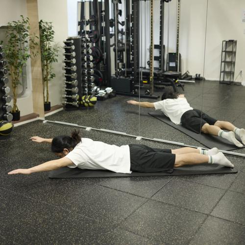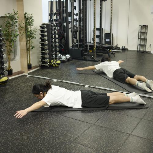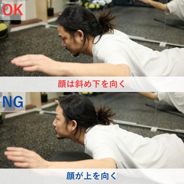スーパーマンは、顔を上げ過ぎると腰に負担がかかりやすいため、首から背中まで自然なラインを保つことが、安全かつ効果的なフォームにつながります。
