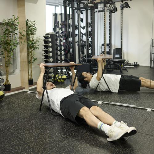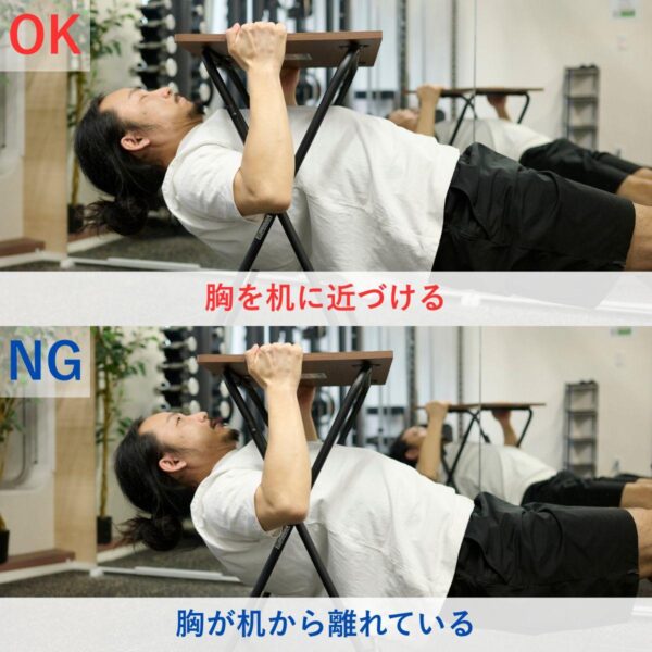 胸をしっかり机に近づけようとすると、自然と肩甲骨を寄せる動きが強くなり、背中に効いている感覚が分かりやすくなりました。途中で引く距離が浅くなると腕ばかり疲れるので、毎回同じ位置まで引く意識が大切だと感じました。