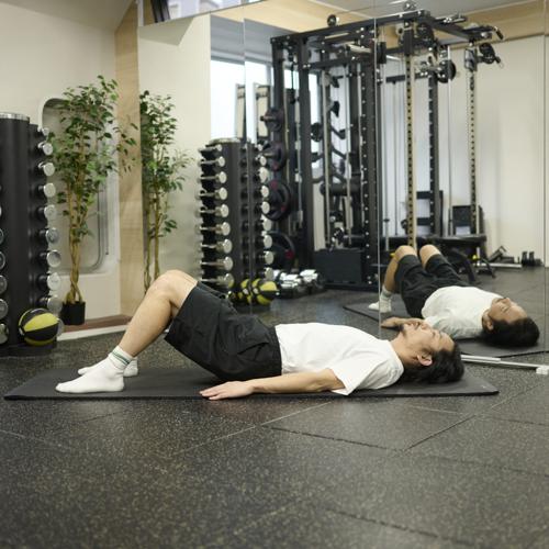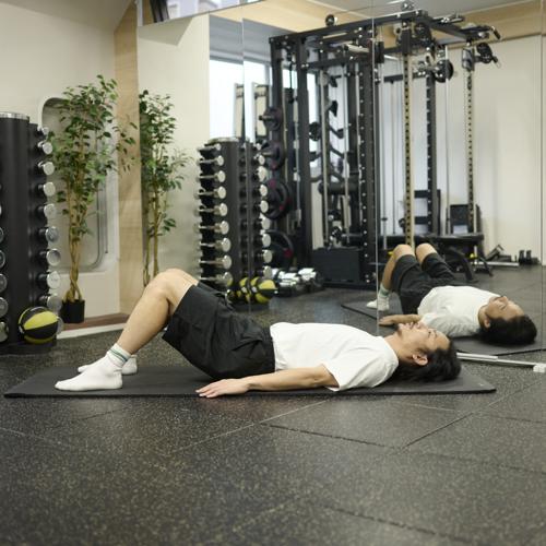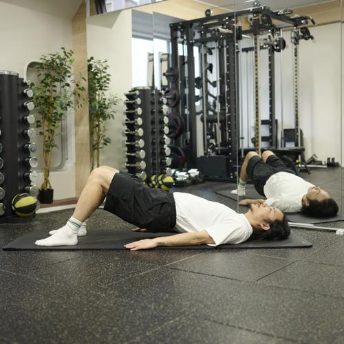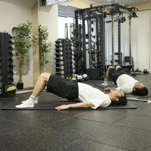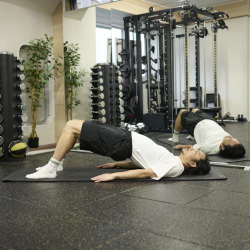 ヒップリフトは、お尻を中心に背中下部も鍛えられる自重種目です。腰からお尻を一直線に保つことで、正しい筋肉に刺激が入り、安全にトレーニングできます。