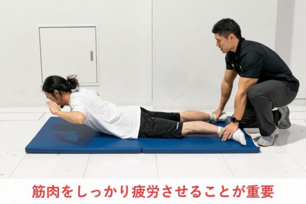 自重で取り組む場合は、回数ではなく筋肉を疲労させるようにしましょう。以下2種の方法などを試しながら、しっかり筋肉を使えているかを判断してみてください。