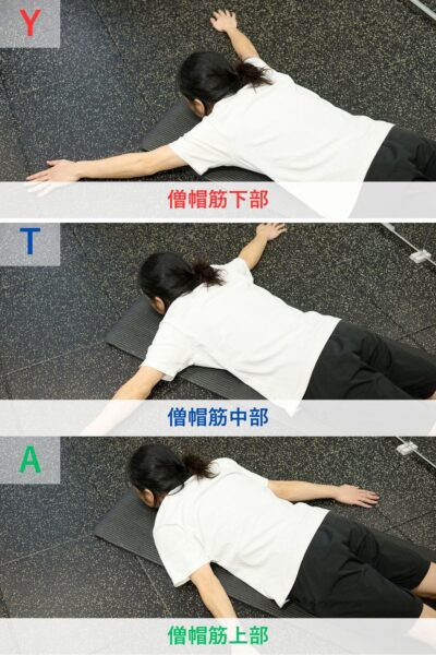 - うつ伏せになり、両腕でY/T/A字をつくる