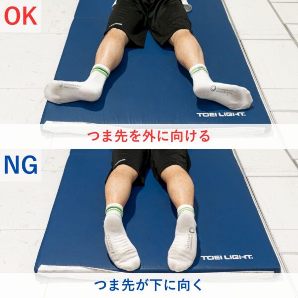 つま先を外に開くことで、下半身が安定しやすくなり、上半身を持ち上げるときのブレが減った気がしました。補助者に足を支えてもらう・ソファーの下に足をいれて固定するなどした方がやりやすいと思います。