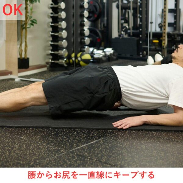 - おへそを軽く引き込み、背中と腰を反らさず一直線を意識する