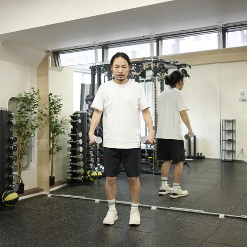 - ダンベルを両手に持ち、体の横に下ろして立つ