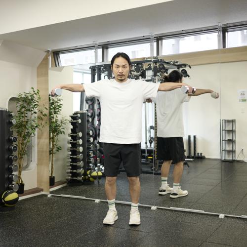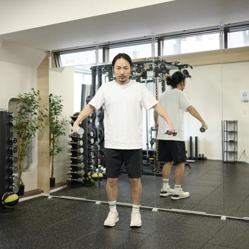 サイドレイズは動作がシンプルな反面、フォームが崩れると負荷が前腕や反動に逃げやすい種目です。とくに初心者の場合、両手同時におこなうと動きが安定せず、狙った刺激が入りにくくなることがあります。その場合は、片手ずつおこなう方法がおすすめです。