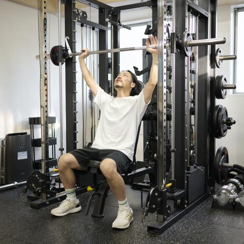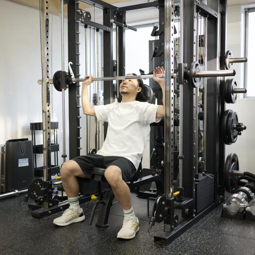 スミスマシンショルダープレスでは、ベンチ角度とバーの初期位置がフォームの安定性を左右します。反動を使わず、下ろす動作もていねいにおこなうことが安全性と効果の両立につながります。