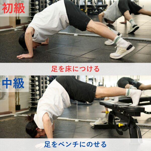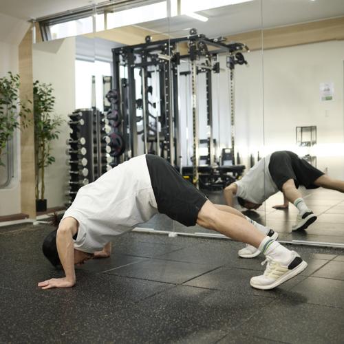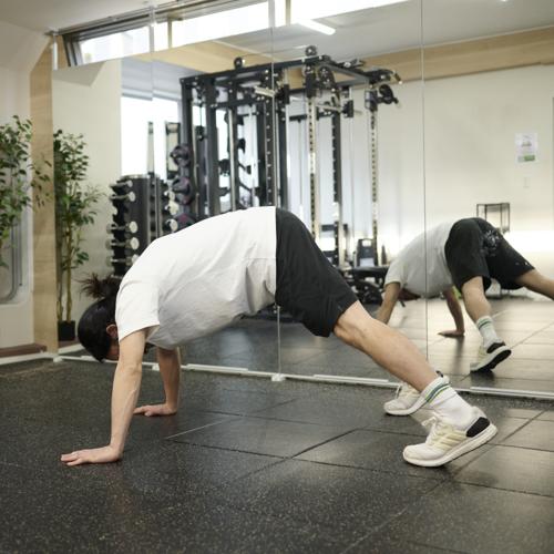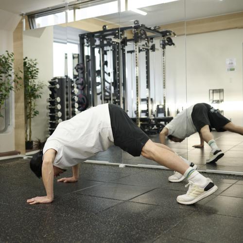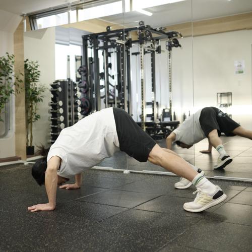 - 通常の腕立て伏せ姿勢から、お尻を高く持ち上げる