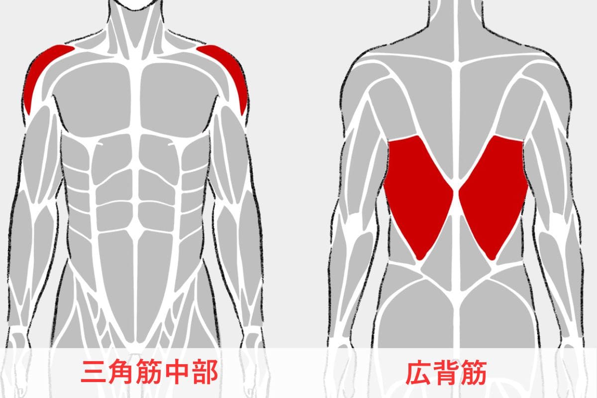 肩幅を強調するためには、ウエストとのバランスも大切です。ウエストと肩幅の差がはっきりすることで、上半身が逆三角形に見えやすくなります。その点で、広背筋のトレーニングも大切です。広背筋は直接「肩幅」を広げる筋肉ではありませんが、上半身全体のシルエットづくりに大きく関わります。