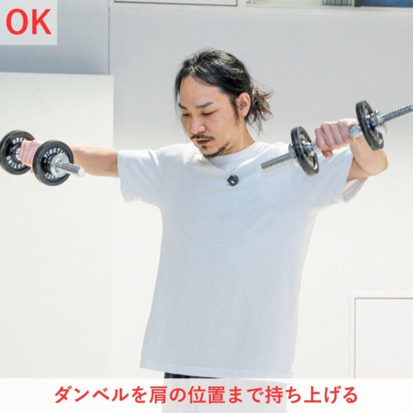 三角筋は肩関節と直結しているため、フォームには注意が必要です。腕を上げすぎると僧帽筋に効きやすくなり、肩関節への負担も増えてしまいます。動作は肩の高さまでを目安に止め、反動を使わず、ていねいにおこなうことが重要です。