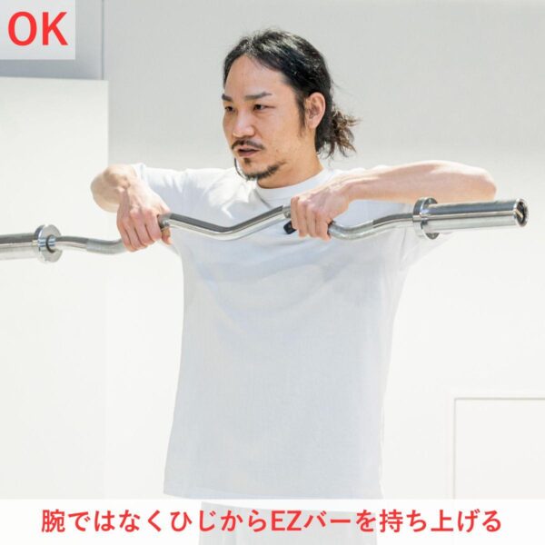 - 勢いを使わず、ひじからゆっくり持ち上げる