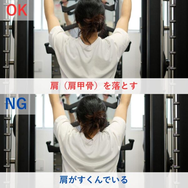 広背筋では、肩をすくめず、肩甲骨を下に下げた状態から動作を始めることが大切です。肩がすくんだままだと、首や肩に力が逃げやすくなります。最初に肩を落とした状態をつくることで、広背筋が使いやすくなります。