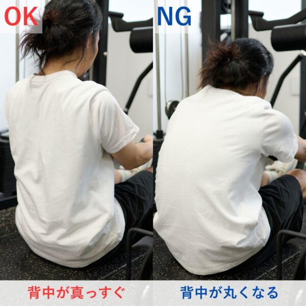 背中が丸まると、ハンドルを引いても背中に効いている感覚が薄くなりました。背中と腰をまっすぐ保つことで、ひじを引いたときに背中がしっかり動いているのが分かりやすかったです。