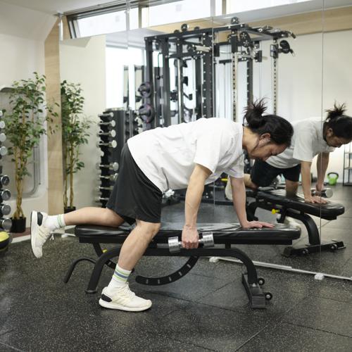 - 片手と同側のひざをベンチにつき、反対の手でダンベルを持つ