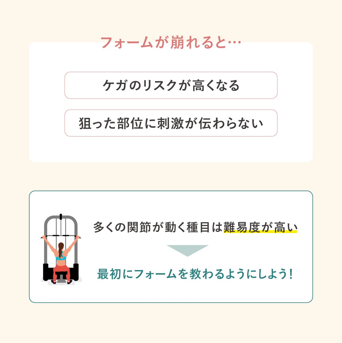 フォームが崩れると狙った部位に効かず、ケガのリスクが高まるため、最初に正しいフォームを身につけることが重要。