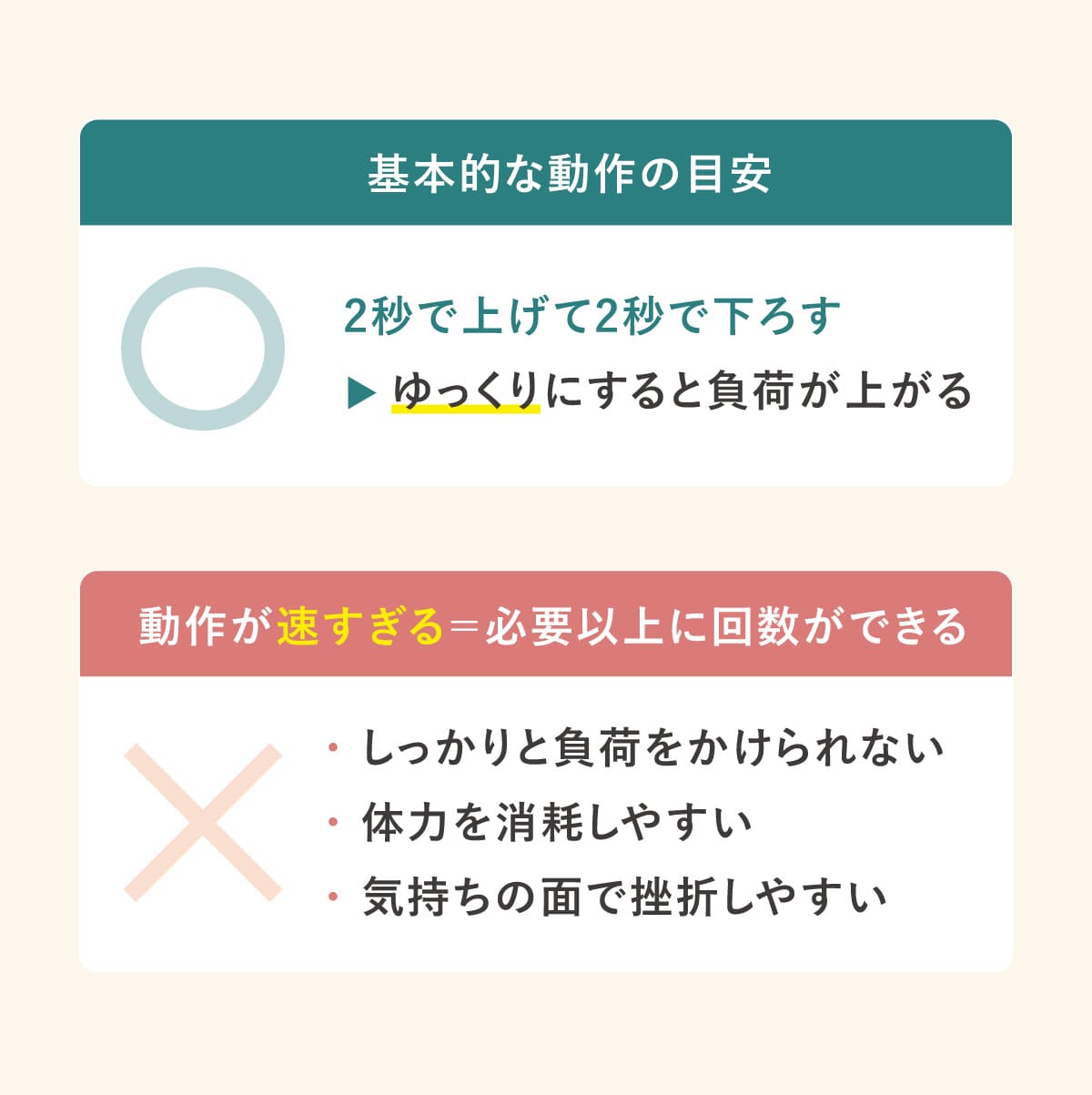 一般的には、2秒で上げて2秒で下ろすくらいでコントロールできるのがちょうどよいテンポと言われているので、まずはこのペースを基準にするとよいでしょう。