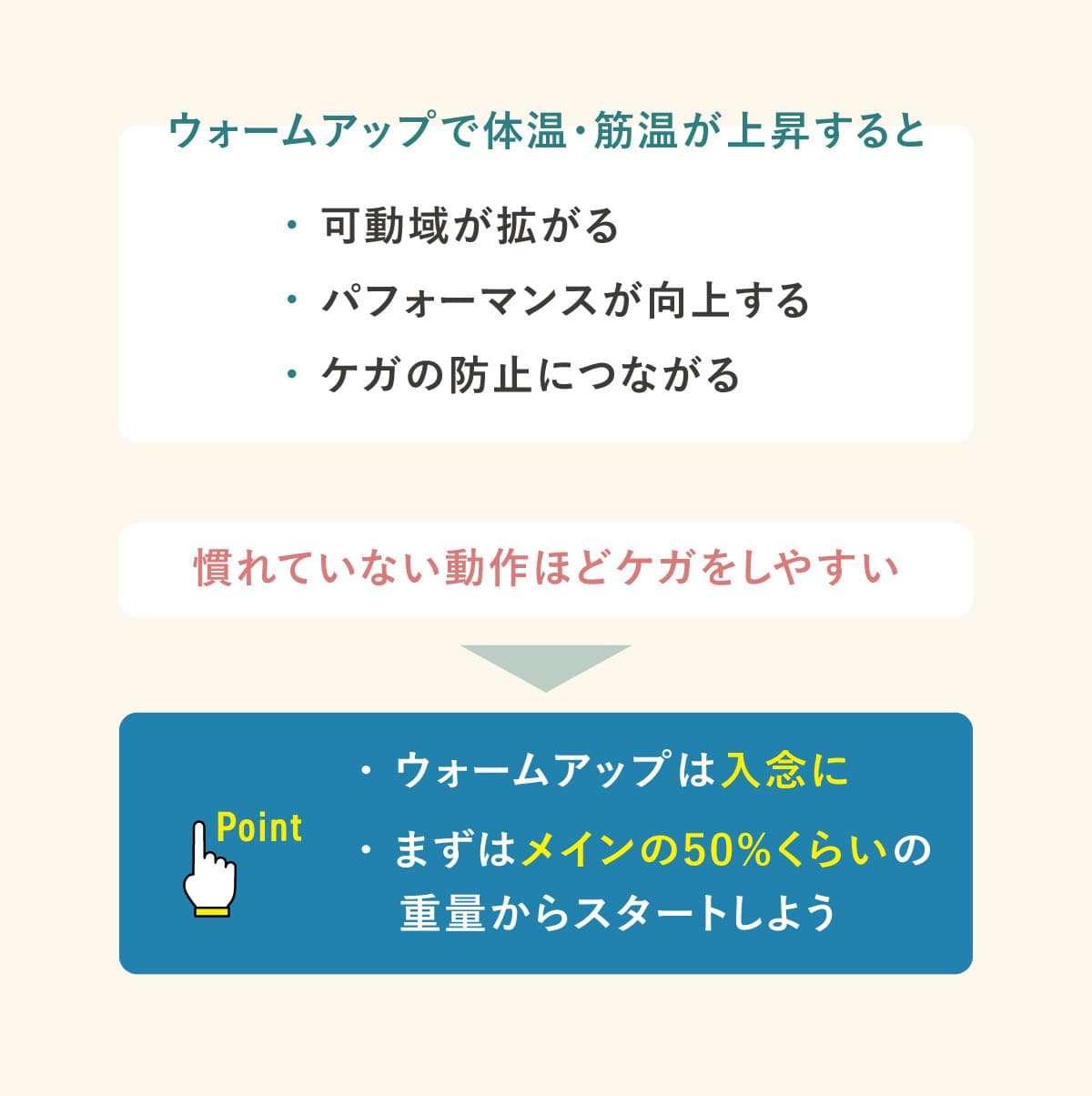慣れていない動作ほどケガをしやすいので、ウォームアップは入念におこなうようにしましょう。また、過去にケガをしたことがある部位も入念におこなう必要があります。