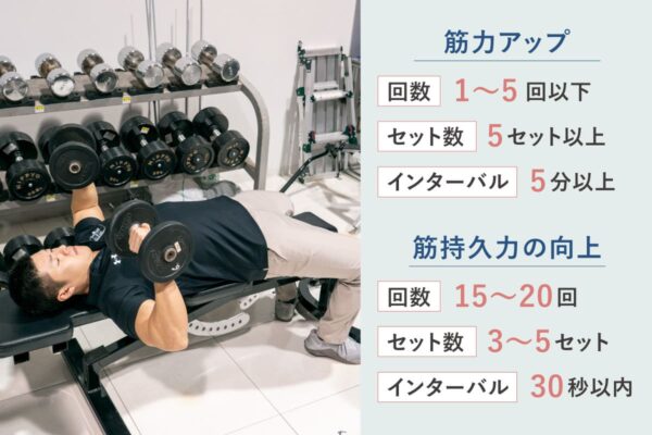 筋力アップの場合は1~5回以下で限界を迎える高重量で5セット以上こなすのが目安となり、筋持久力の向上を目的とした場合は、15~20回ほどで限界を迎える重量で3~5セットこなすのが目安となる。