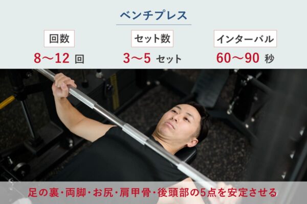 また、ベンチプレスのような高重量を扱う場合、筋肉の力だけでなく筋肉を動かす神経系の力も重要になってくるので、短くても5分は休憩を取るようにしよう。