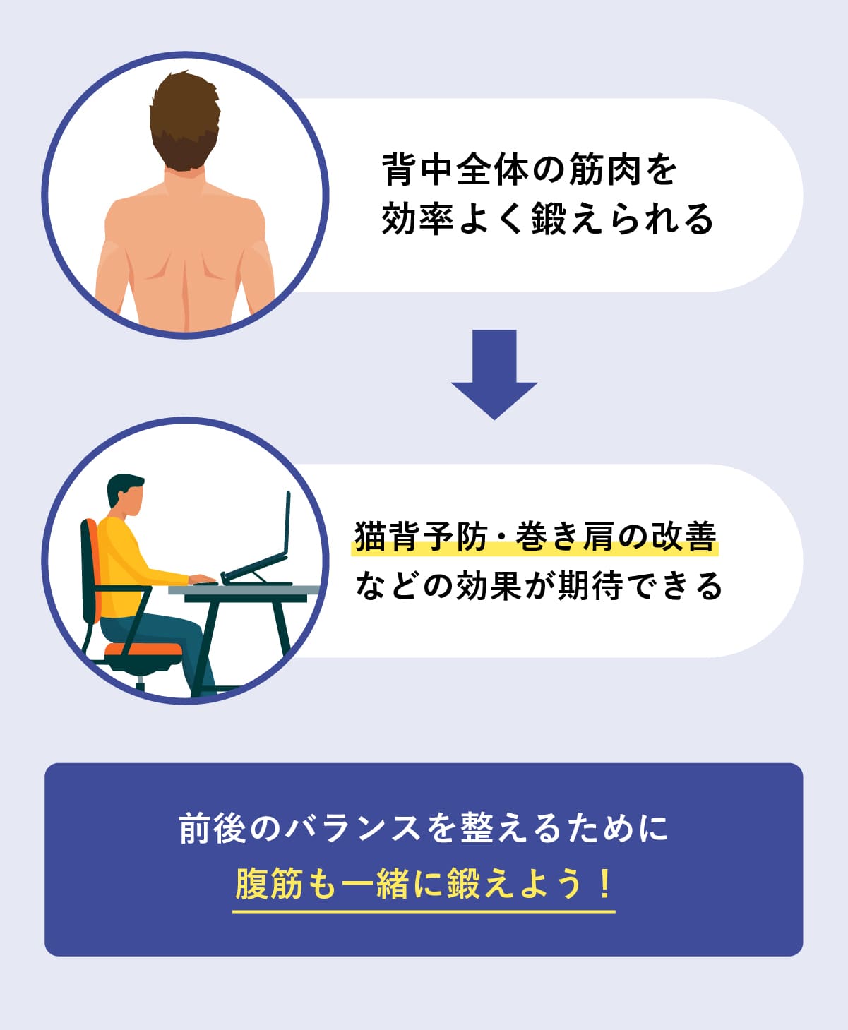 - 背中の筋肉を鍛えることで猫背・巻き肩の予防になる