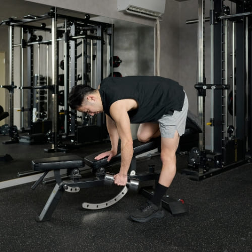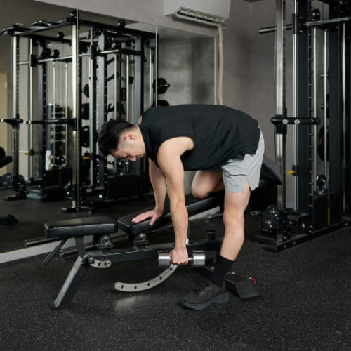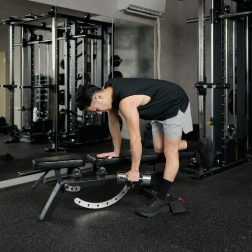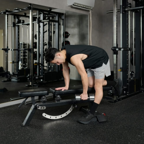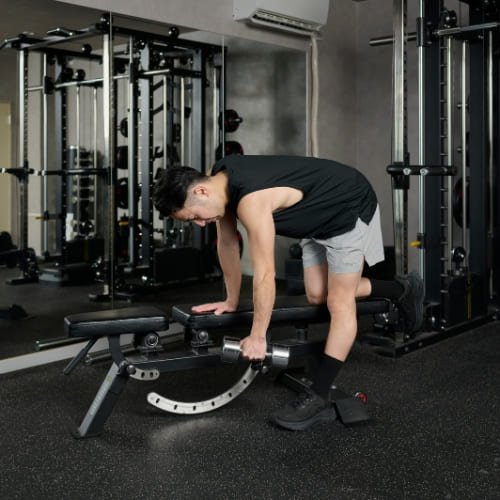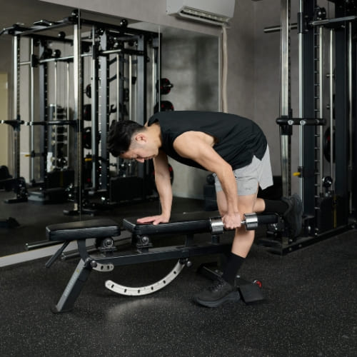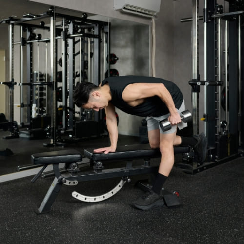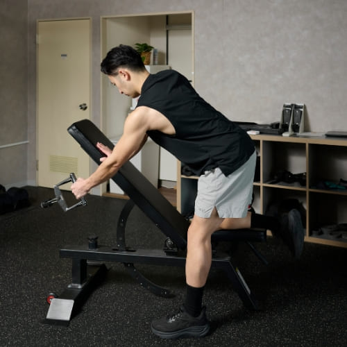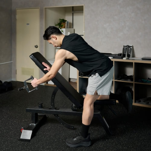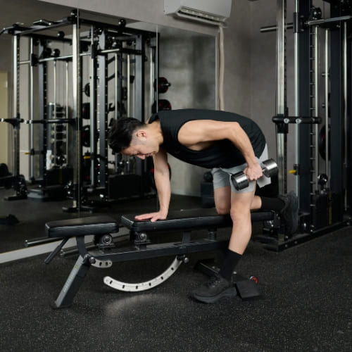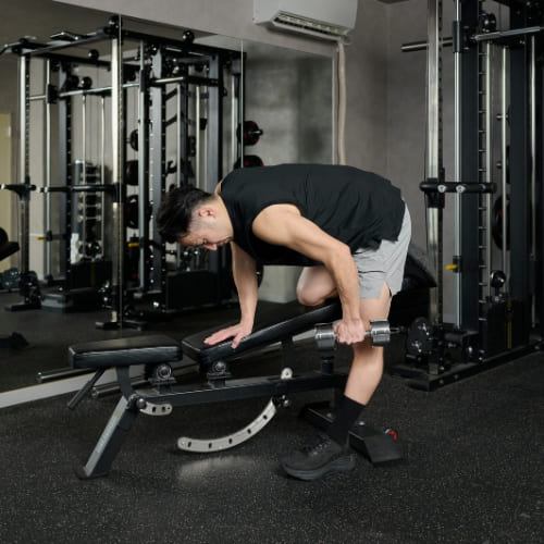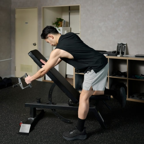 - 片膝と片手をベンチに置き、もう片手でダンベルを握る