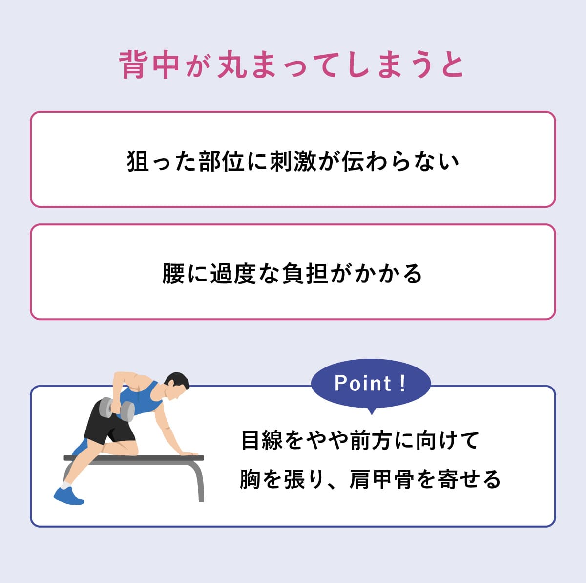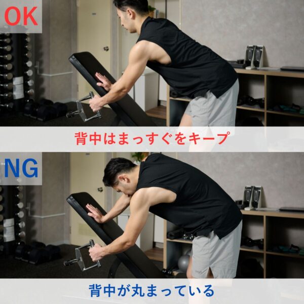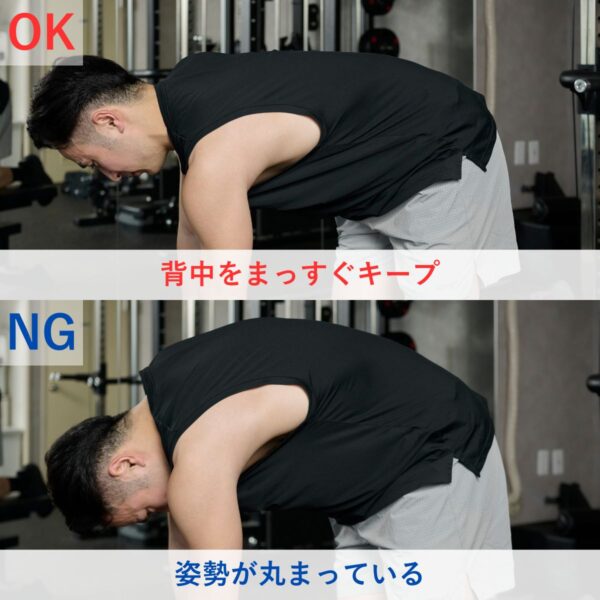 背中が丸まってしまうと、広背筋や僧帽筋といったターゲットの筋肉に十分な刺激が入らず、トレーニング効果が大きく低下してしまう。また、丸まった状態でダンベルを引き上げると腰に過度な負担がかかり、腰痛やケガのリスクも高まる。