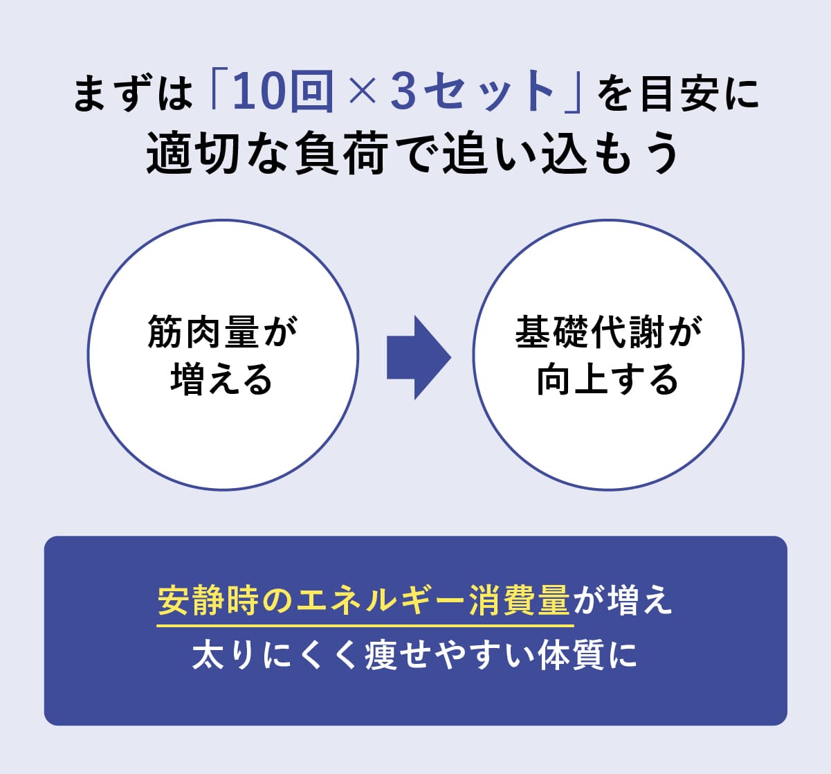 基礎代謝を高めるにはしっかりと筋肉を成長させる必要があるため、まずは10回×3セットを目安に、適切な負荷をかけて追い込むことが大切。