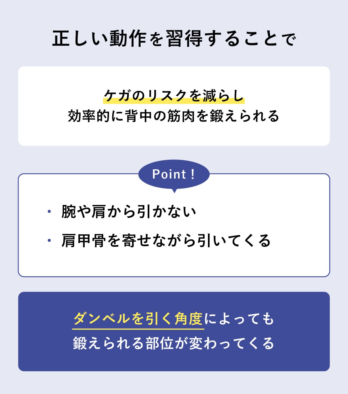 肩甲骨を動かす意識を強く持ち、背中の筋肉が動いた結果ダンベルが動いたというイメージで動作することがコツです!