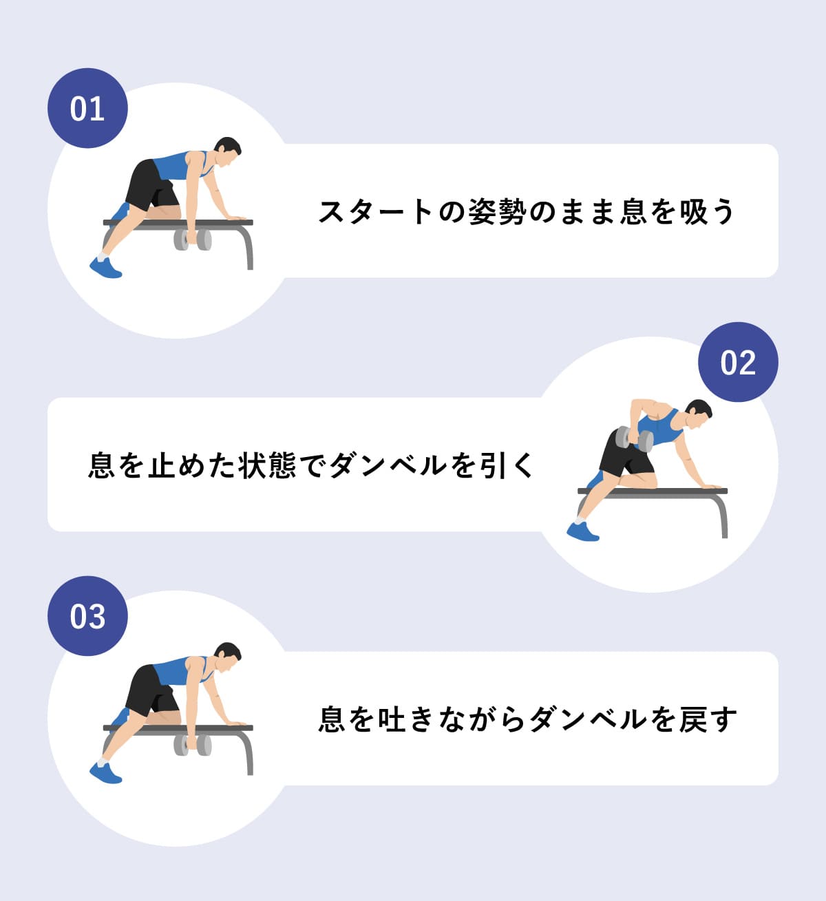 ダンベルを引くときにはしっかりと身体の中に空気を溜めた状態にしておきたいので、いきなり引くのではなく、スタートの姿勢のまま、息を吸って空気を溜めることから始めよう。