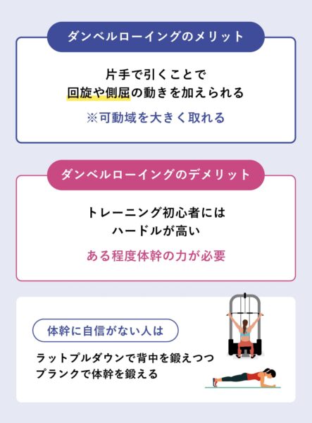 ダンベルローイングは回旋や側屈の動きを加えられ、背中の筋肉をしっかり収縮させられる種目だが、正しい姿勢のキープや肩甲骨から引く動作には体幹の安定が必要で、初心者にはハードルが高い。