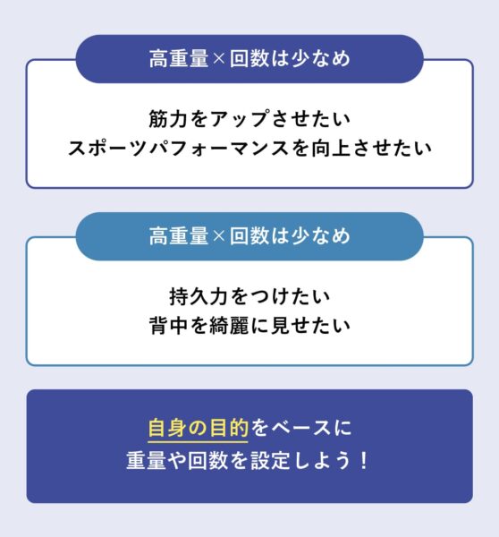 筋力をアップさせたい・スポーツパフォーマンスを向上させたい場合は「高重量×回数は少なめ」持久力をつけたい・背中を綺麗に見せたい場合は「低重量×回数多め」の設定がベースになる。